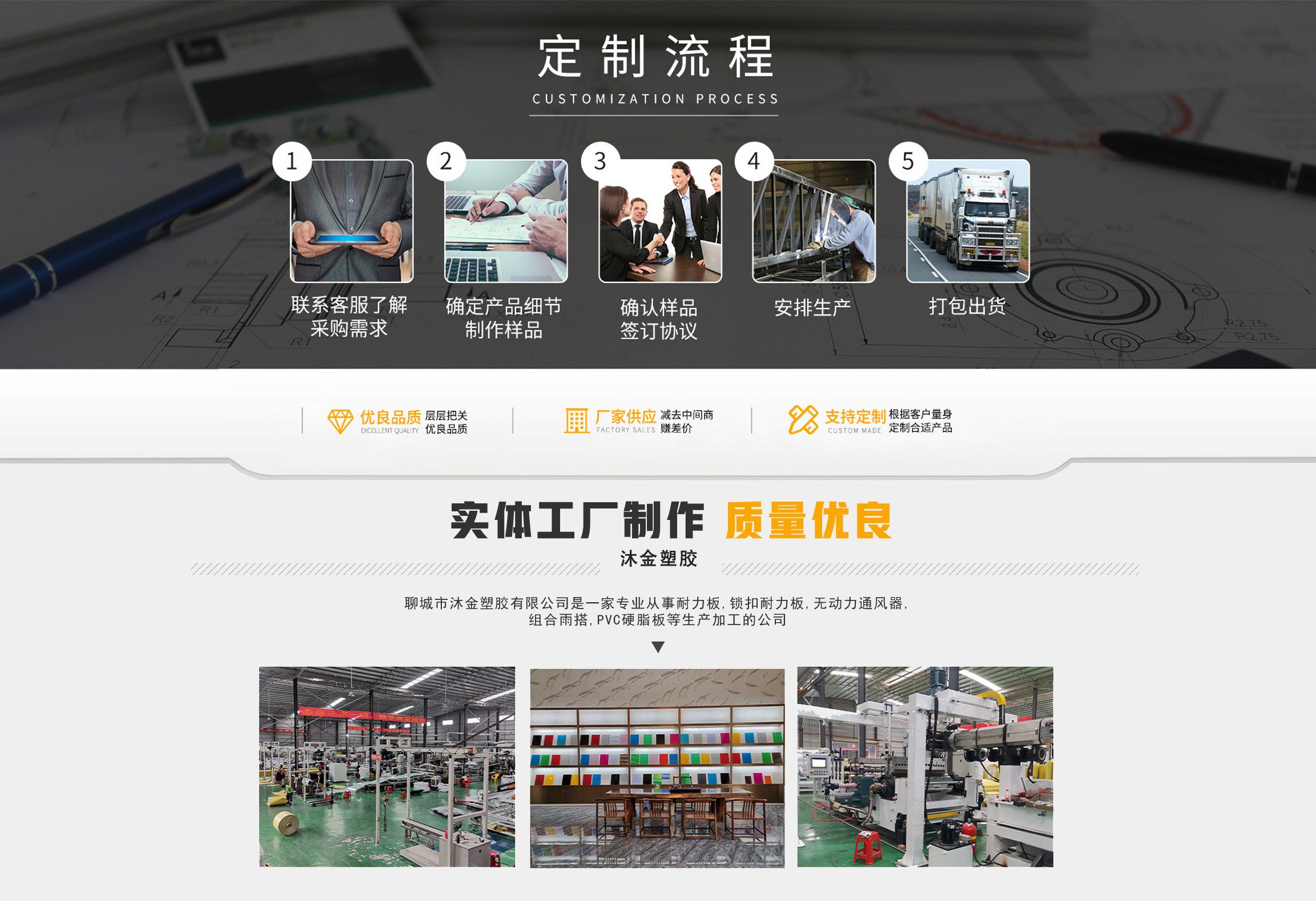 聊城市沐金塑膠有限公司注冊資金2180萬元,占地20000余平方,擁有自建廠房15000平方,員工100余名。10余年來,公司主營耐力板,鎖扣耐力板,耐力板深加工,無動力通風(fēng)器,組合雨搭,PVC硬脂板,耐力板廠家等板材的發(fā)展戰(zhàn)略,逐漸成長為綜合性企業(yè)。 公司擁有多條板材共擠生產(chǎn)線,采用世界知名品牌進口原材料和先進工藝,依據(jù)完善的ISO9001質(zhì)量管理體系和ISO14001環(huán)境管理體系,為產(chǎn)品的卓越品質(zhì)提供了強有力的保證。憑借過硬的創(chuàng)新能力和堅實的硬件基礎(chǔ),贏創(chuàng)已成為國內(nèi)領(lǐng)先的熱塑性板材生產(chǎn)商,產(chǎn)品被廣泛應(yīng)用于建筑業(yè)、農(nóng)業(yè)、工業(yè)、廣告業(yè)、安防行業(yè)及DIY領(lǐng)域?! 」臼冀K致力于通過提供最優(yōu)的板材應(yīng)用解決方案,為客戶創(chuàng)造最高的價值;堅守創(chuàng)新、質(zhì)量、靈活、服務(wù)和速度的核心價值觀;堅持“完美的產(chǎn)品需要完美服務(wù)的支持”的經(jīng)營理念,努力實現(xiàn)成為世界領(lǐng)先的板材與解決方案供應(yīng)商的夢想?! ≡谖磥?,公司將立足客戶需求,不斷改變和完善現(xiàn)有產(chǎn)品,拓展產(chǎn)品線和充分開發(fā)板材的應(yīng)用領(lǐng)域,為客戶創(chuàng)造全方位的價值。同時更好地實現(xiàn)員工的價值,實現(xiàn)公司團隊的價值。我們將與您一起創(chuàng)贏未來! 企業(yè)使命:成為世界領(lǐng)先的板材與解決方案供應(yīng)商。 公司愿景:通過提供最優(yōu)的板材應(yīng)用解決方案,為客戶創(chuàng)造最高的價值?! 『诵膬r值觀:質(zhì)量...